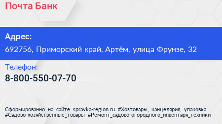 Почта Банк по адресу 692756, Приморский край, Артём, улица Фрунзе, 32 в дальнейшем Организация, размещена в следующих категориях: