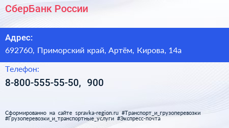 СберБанк России по адресу 692760, Приморский край, Артём, Кирова, 14а в дальнейшем Организация, размещена в следующих категориях: