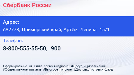 СберБанк России по адресу 692778, Приморский край, Артём, Ленина, 15/1 в дальнейшем Организация, размещена в следующих категориях: