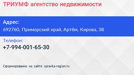 ТРИУМФ, агентство недвижимости по адресу 692760, Приморский край, Артём, Кирова, 38 в дальнейшем Организация, размещена в следующих категориях: