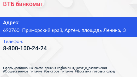 ВТБ, банкомат по адресу 692760, Приморский край, Артём, площадь Ленина, 3 в дальнейшем Организация, размещена в следующих категориях:
