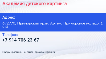 Академия детского картинга по адресу 692770, Приморский край, Артём, Приморское кольцо, 1 ст5 в дальнейшем Организация, размещена в следующих категориях: