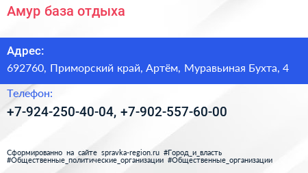 Амур, база отдыха по адресу 692760, Приморский край, Артём, Муравьиная Бухта, 4 в дальнейшем Организация, размещена в следующих категориях: