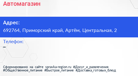 Автомагазин по адресу 692764, Приморский край, Артём, Центральная, 2 в дальнейшем Организация, размещена в следующих категориях: