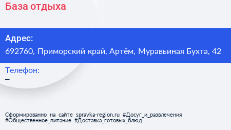 База отдыха по адресу 692760, Приморский край, Артём, Муравьиная Бухта, 42 в дальнейшем Организация, размещена в следующих категориях: