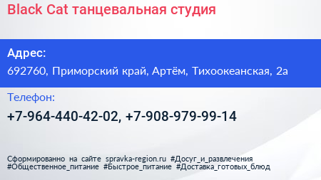 Black Сat, танцевальная студия по адресу 692760, Приморский край, Артём, Тихоокеанская, 2а в дальнейшем Организация, размещена в следующих категориях: