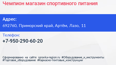 Чемпион, магазин спортивного питания по адресу 692760, Приморский край, Артём, Лазо, 11 в дальнейшем Организация, размещена в следующих категориях: