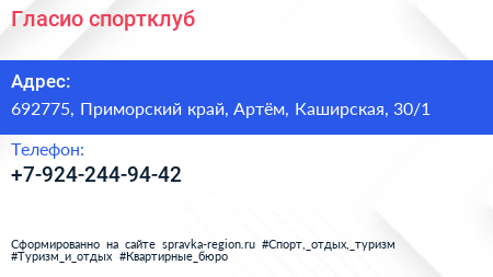 Гласио, спортклуб по адресу 692775, Приморский край, Артём, Каширская, 30/1 в дальнейшем Организация, размещена в следующих категориях: