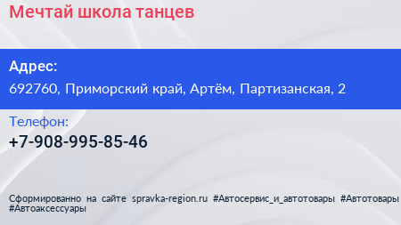 Мечтай, школа танцев по адресу 692760, Приморский край, Артём, Партизанская, 2 в дальнейшем Организация, размещена в следующих категориях: