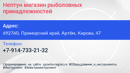Нептун, магазин рыболовных принадлежностей по адресу 692760, Приморский край, Артём, Кирова, 47 в дальнейшем Организация, размещена в следующих категориях:
