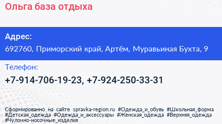 Ольга, база отдыха по адресу 692760, Приморский край, Артём, Муравьиная Бухта, 9 в дальнейшем Организация, размещена в следующих категориях: