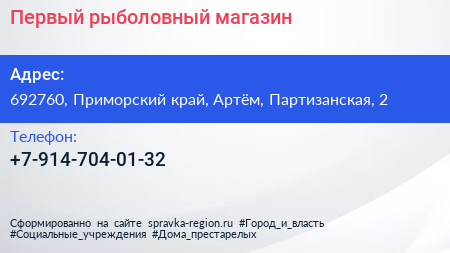Первый рыболовный, магазин по адресу 692760, Приморский край, Артём, Партизанская, 2 в дальнейшем Организация, размещена в следующих категориях: