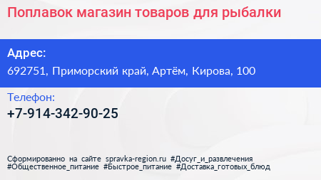 Поплавок, магазин товаров для рыбалки по адресу 692751, Приморский край, Артём, Кирова, 100 в дальнейшем Организация, размещена в следующих категориях: