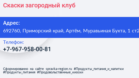 Скаски, загородный клуб по адресу 692760, Приморский край, Артём, Муравьиная Бухта, 1 ст2 в дальнейшем Организация, размещена в следующих категориях: