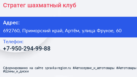 Стратег, шахматный клуб по адресу 692760, Приморский край, Артём, улица Фрунзе, 60 в дальнейшем Организация, размещена в следующих категориях: