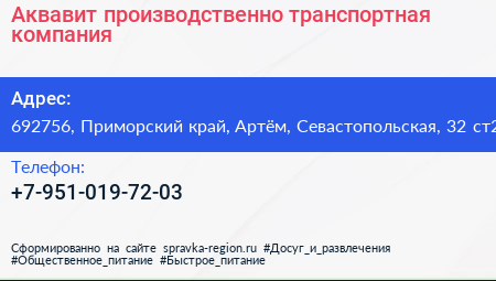 Аквавит, производственно-транспортная компания по адресу 692756, Приморский край, Артём, Севастопольская, 32 ст2 в дальнейшем Организация, размещена в следующих категориях:
