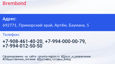 Brembond по адресу 692771, Приморский край, Артём, Баумана, 5 в дальнейшем Организация, размещена в следующих категориях: