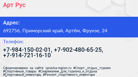 Арт-Рус по адресу 692756, Приморский край, Артём, Фрунзе, 24 в дальнейшем Организация, размещена в следующих категориях: