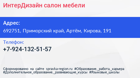 ИнтерДизайн, салон мебели по адресу 692751, Приморский край, Артём, Кирова, 191 в дальнейшем Организация, размещена в следующих категориях: