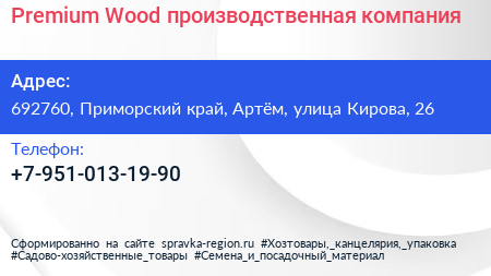 Premium Wood, производственная компания по адресу 692760, Приморский край, Артём, улица Кирова, 26 в дальнейшем Организация, размещена в следующих категориях: