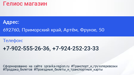Гелиос, магазин по адресу 692760, Приморский край, Артём, Фрунзе, 50 в дальнейшем Организация, размещена в следующих категориях: