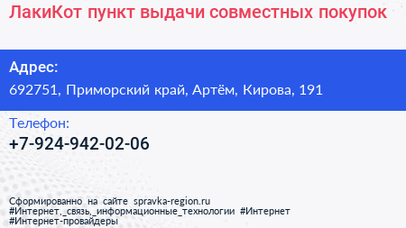 ЛакиКот, пункт выдачи совместных покупок по адресу 692751, Приморский край, Артём, Кирова, 191 в дальнейшем Организация, размещена в следующих категориях: