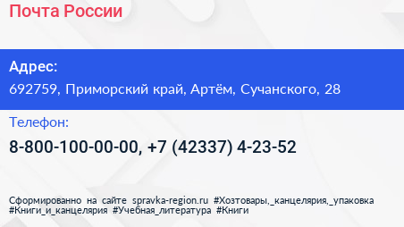 Почта России по адресу 692759, Приморский край, Артём, Сучанского, 28 в дальнейшем Организация, размещена в следующих категориях: