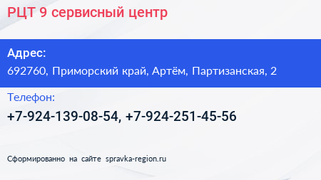 РЦТ-9, сервисный центр по адресу 692760, Приморский край, Артём, Партизанская, 2 в дальнейшем Организация, размещена в следующих категориях: