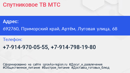 Спутниковое ТВ МТС по адресу 692760, Приморский край, Артём, Луговая улица, 68 в дальнейшем Организация, размещена в следующих категориях: