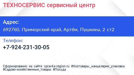 ТЕХНОСЕРВИС, сервисный центр по адресу 692760, Приморский край, Артём, Пушкина, 2 ст2 в дальнейшем Организация, размещена в следующих категориях: