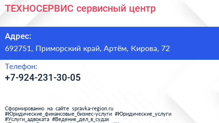 ТЕХНОСЕРВИС, сервисный центр по адресу 692751, Приморский край, Артём, Кирова, 72 в дальнейшем Организация, размещена в следующих категориях: