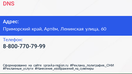 DNS по адресу Приморский край, Артём, Ленинская улица, 60 в дальнейшем Организация, размещена в следующих категориях: