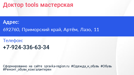 Доктор tools, мастерская по адресу 692760, Приморский край, Артём, Лазо, 11 в дальнейшем Организация, размещена в следующих категориях: