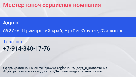 Мастер ключ, сервисная компания по адресу 692756, Приморский край, Артём, Фрунзе, 32а киоск в дальнейшем Организация, размещена в следующих категориях: