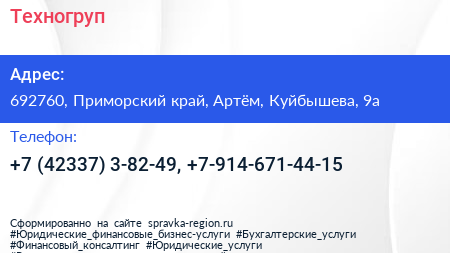 Техногруп по адресу 692760, Приморский край, Артём, Куйбышева, 9а в дальнейшем Организация, размещена в следующих категориях: