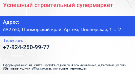 Успешный, строительный супермаркет по адресу 692760, Приморский край, Артём, Пионерская, 1 ст2 в дальнейшем Организация, размещена в следующих категориях: