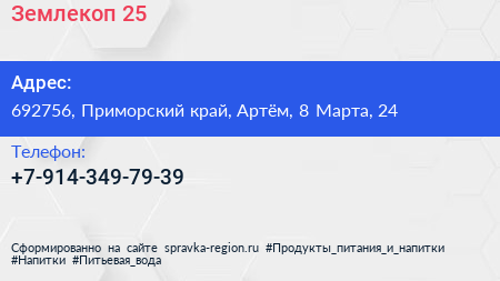 Землекоп 25 по адресу 692756, Приморский край, Артём, 8 Марта, 24 в дальнейшем Организация, размещена в следующих категориях: