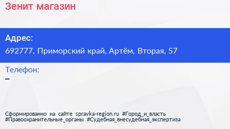 Зенит, магазин по адресу 692777, Приморский край, Артём, Вторая, 57 в дальнейшем Организация, размещена в следующих категориях: