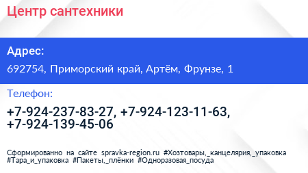 Центр сантехники по адресу 692754, Приморский край, Артём, Фрунзе, 1 в дальнейшем Организация, размещена в следующих категориях: