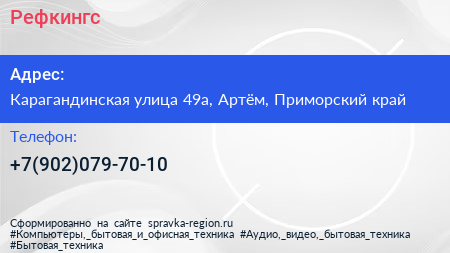Рефкингс по адресу Карагандинская улица 49а, Артём, Приморский край в дальнейшем Организация, размещена в следующих категориях: