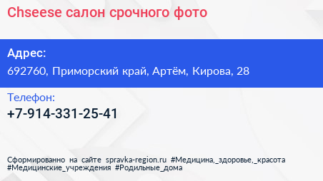 Chseese, салон срочного фото по адресу 692760, Приморский край, Артём, Кирова, 28 в дальнейшем Организация, размещена в следующих категориях: