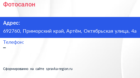 Фотосалон по адресу 692760, Приморский край, Артём, Октябрьская улица, 4а в дальнейшем Организация, размещена в следующих категориях: