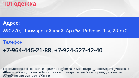 101 одежка по адресу 692770, Приморский край, Артём, Рабочая 1-я, 28 ст2 в дальнейшем Организация, размещена в следующих категориях:
