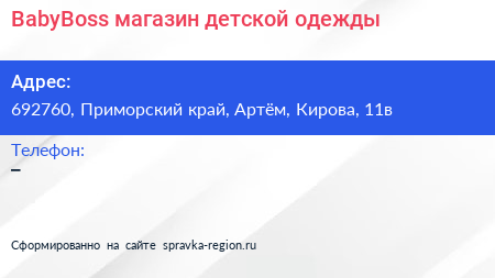 BabyBoss, магазин детской одежды по адресу 692760, Приморский край, Артём, Кирова, 11в в дальнейшем Организация, размещена в следующих категориях:
