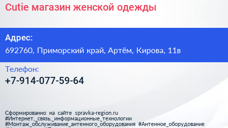 Cutie, магазин женской одежды по адресу 692760, Приморский край, Артём, Кирова, 11в в дальнейшем Организация, размещена в следующих категориях: