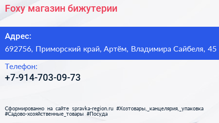 Foxy, магазин бижутерии по адресу 692756, Приморский край, Артём, Владимира Сайбеля, 45 в дальнейшем Организация, размещена в следующих категориях: