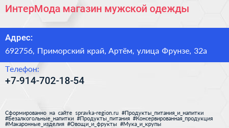 ИнтерМода, магазин мужской одежды по адресу 692756, Приморский край, Артём, улица Фрунзе, 32а в дальнейшем Организация, размещена в следующих категориях: