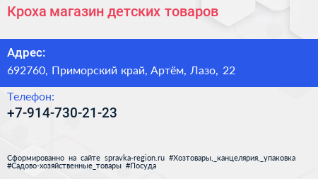 Кроха, магазин детских товаров по адресу 692760, Приморский край, Артём, Лазо, 22 в дальнейшем Организация, размещена в следующих категориях: