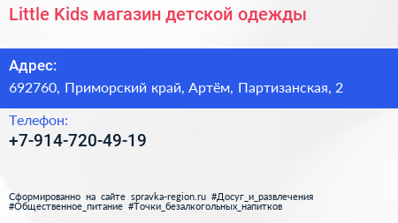 Little Kids, магазин детской одежды по адресу 692760, Приморский край, Артём, Партизанская, 2 в дальнейшем Организация, размещена в следующих категориях: