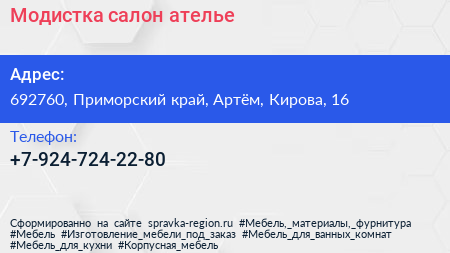 Модистка, салон-ателье по адресу 692760, Приморский край, Артём, Кирова, 16 в дальнейшем Организация, размещена в следующих категориях: